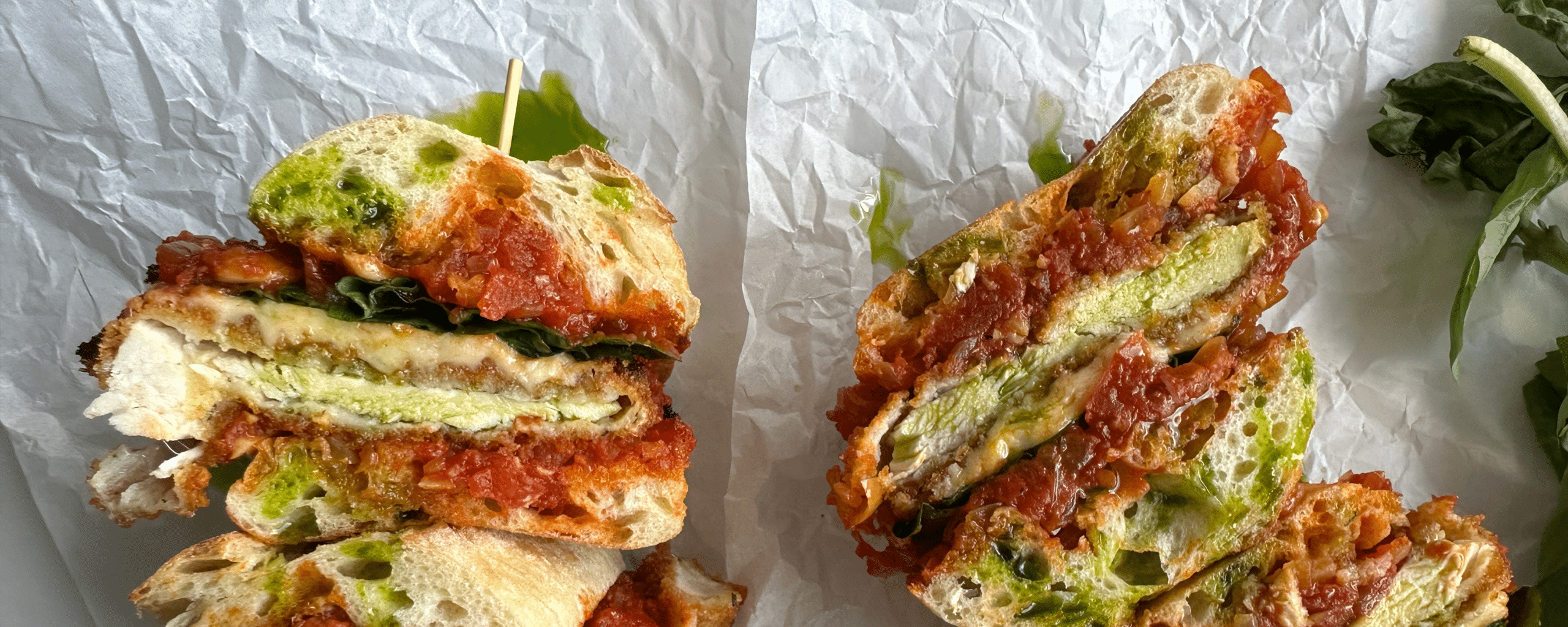 4. Top cheese half with basil leaves and close sandwich. Serve with extra sauce and basil oil.